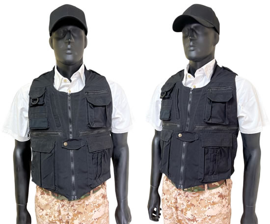 Safari type vest with high density polyethylene PEUD fabric ballistic panels. This model is a unique garment with specific functions and ergonomic design interface for everyday use.