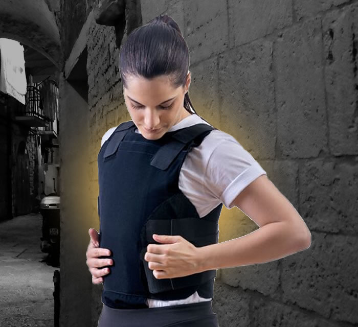 Concealable vest manufactured with high density polyethylene fabric PEUD or aramid UD fabrics, enclosed in a 100% waterproof tafeta fabric sealed by ultrasonic welding.